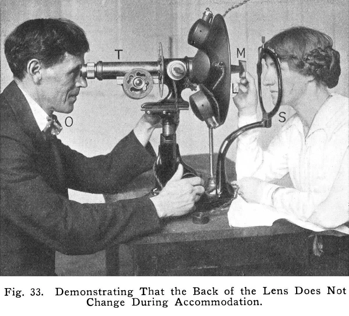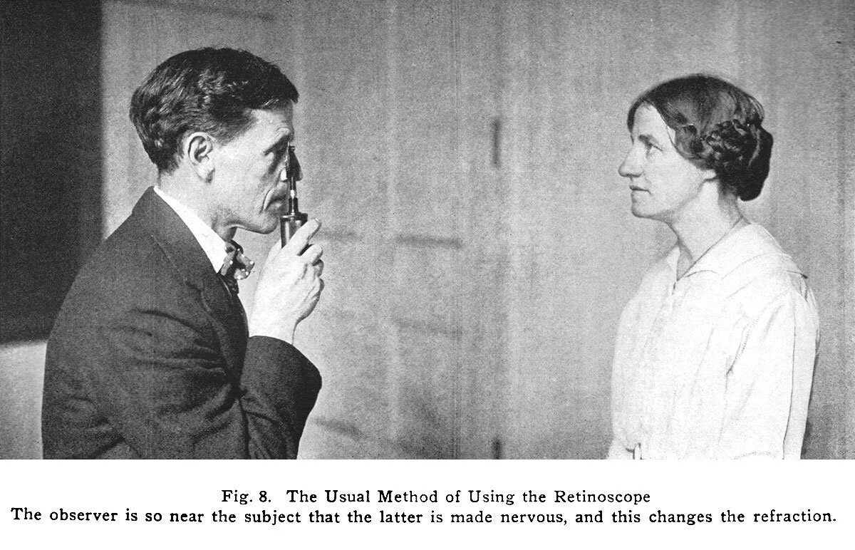 Teaching a minister friend to use the retinoscope, he found out that his eyes adjusted to the distance when he was making an effort to read. Only when he relaxed his mind without making an effort, the type cleared up. It took him almost a year to be able to read microscopic type (2 pt type size) at 4 inches from his eyes. He claimed that it never took him that long to have his patients do the same.